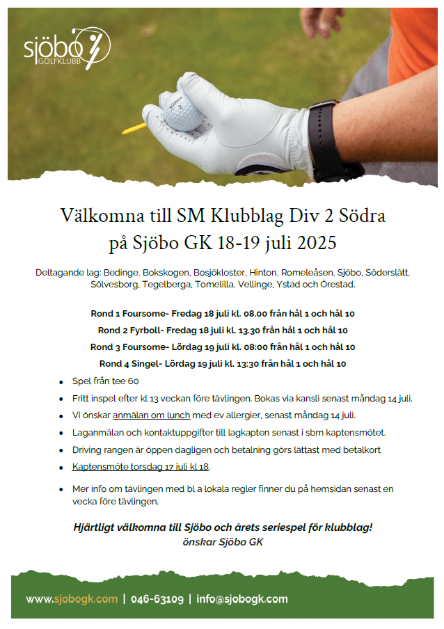 Välkomna till Sjöbo GK för årets upplaga av SM Klubblag för herrar Div 2 Skåne Södra.